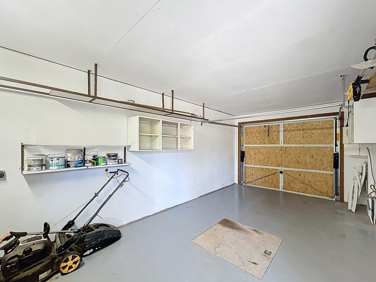 De woning beschikt over een grote, lichte woonkamer met een pelletkachel, een gezellige open keuken, een slaapkamer met aangrenzende doucheruimte en een ruime garage met wasruimte. De zolder biedt extra opbergruimte.